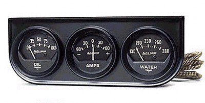 Auto Meter Auto Gage Black 2-1/16 inch (52.4 millimeter) Mechanical Three-Gauge Console (Oil/Ampere/Water, 0-100 pounds per square inch / -60 - +60 / 130-280 degree fahrenheit) feature bronze bourdon tube 270 degree sweep movements and durable nylon gearing that have made these rugged and long lasting gauges a proven high performance favorite for over 25 years. These mechanical gauges require no electrical power for operation making them an ideal choice for vehicles with no or low powered electrical systems. Includes 6 feet tubing and 10 feet nylon tubing with 1/8 inch NPT fittings. Also includes 1/4 inch NPT adapter/fitting, 3/8 inch NPT adapter/fitting and 1/2 inch NPT adapter/fitting.